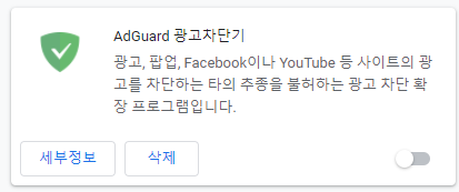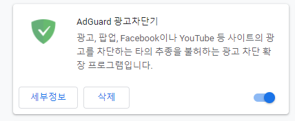 2. 아래 확장 프로그램과 같이 광고를 차단해 주는 프로그램이 있는지 확인하고 삭제하거나 체크 해제를 해줍니다.