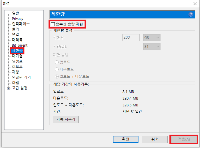 설정에서 제한량으로 가서 □ 송수신 총량 제한 체크를 해제해 주시고 적용 및 확인을 클릭해 주세요.