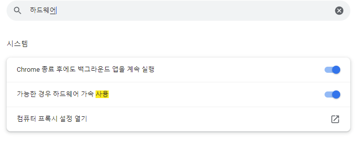 "가능한 경우 하드웨어 가속 사용 " 을 체크 하기